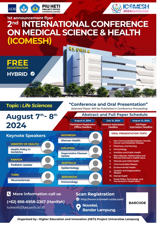 Continuing the success of the previous ICOMESH, this year’s conference will be held again in Bandar Lampung, Sumatra Island, Indonesia, hosted by University of Lampung. The 2024 conference, continuing the tradition and the goals of ICOMESH, consists of plenary presentations by leading researchers in health and experts from regulatory institutions, as well as research paper presentations. The theme of the 2024 conference is ¨Life Sciences¨.